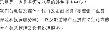 迅羽擁有豐富的客服中心建設(shè)及管理實(shí)務(wù)經(jīng)驗(yàn),熟悉各行業(yè)的運(yùn)營(yíng)情況,為客戶提供一站式的電話數(shù)據(jù)處理解決方案。